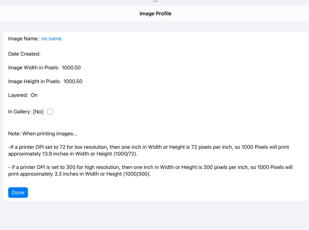 Note that only Sketchbook artwork with the ‘In Gallery’ flag set to ‘Yes’ will appear in the Gallery. To modify this flag, go to the Image Profile screen (as described below) by pressing the Blue P in the upper right navigation bar. Change the flag to ‘Yes’ and then save the artwork to the Sketchbook.