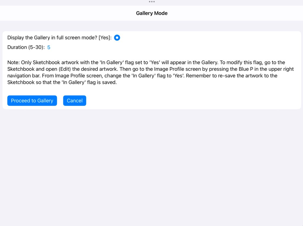 Choose Gallery Mode to display artwork in the Sketchbook in gallery setting. After choosing Gallery Mode, the Gallery Mode screen will appear. In this screen choose whether to display artwork in full screen or partial screen mode.