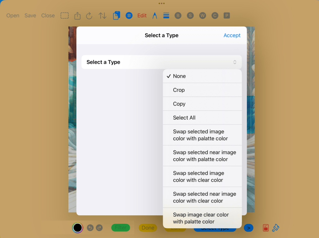 For Edit mode: Edit mode will allow for Edit types as illustrated below. They can be accessed by first pressing the Edit button. Then press the pencil tip icon in the upper navigation bar to select a specific Edit type.