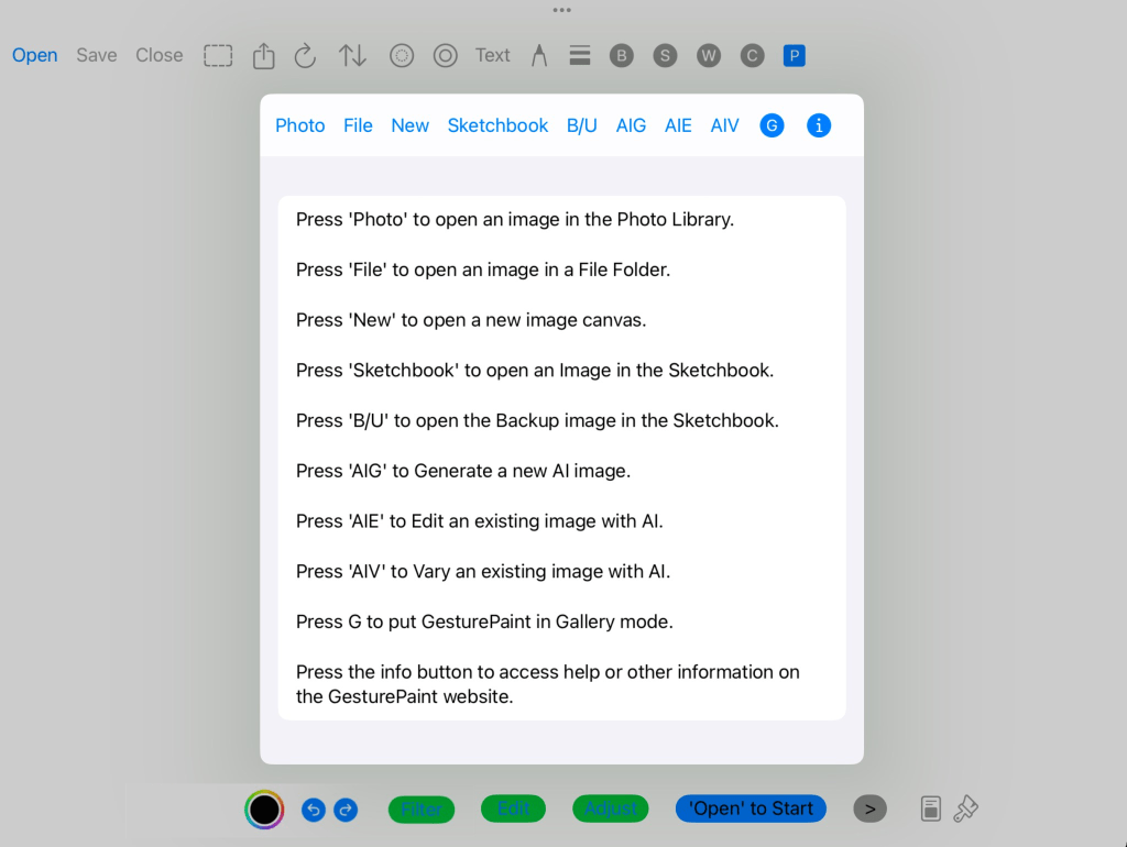Welcome to GesturePaint version 4. From the Startup screen press the Open button to get several Open options.